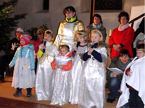 … Die Kirche war bis auf den letzten Platz gefüllt, so viele Menschen, die uns zusehen wollten. Da wurde die Aufregung noch etwas größer! Der Gottesdienst wurde von den Bläsern und einem kleinen Chor begleitet. Die Könige, Theresa und Katharina Pohl und Miriam Kunkel, spielten auf der Geige und Flöte, als wir gebastelte Sterne an die Gottesdienstbesucher verteilten. Jeder hatte seine Aufgabe, konnte seinen Beitrag leisten. Die Mikrofone halfen uns, bis in die letzte Reihe Gottes frohe Botschaft von Weihnachten zu verkünden. Besonders die textsicheren kleinen Engel um Familie Kayser, die alle mit „Ihr Kinderlein kommet“ zur Krippe einluden, zauberten Lächeln und Schmunzeln in die Gesichter aller.