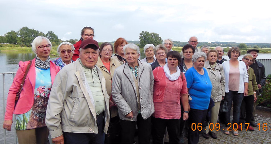 Am 6. September ging es also mit drei Kleinbussen gegen 10.30 Uhr los. Vor der Gaststätte in Lebus angekommen, gab es eine freudige Begrüßung untereinander. Da die Teilnehmer aus vielen verschiedenen Orten kommen, sieht und trifft man sich ja nur einmal im Jahr, eben zum gemeinsamen Ausflug. Auch die Plätze in der Gaststätte werden dann so ausgewählt, dass man sich so richtig gut unterhalten und austauschen kann. Zum guten Essen bot die Gaststätte auch einen wunderbaren Blick, direkt vom Sitzplatz am Tisch, auf die Oder. Das war alles sehr schön.