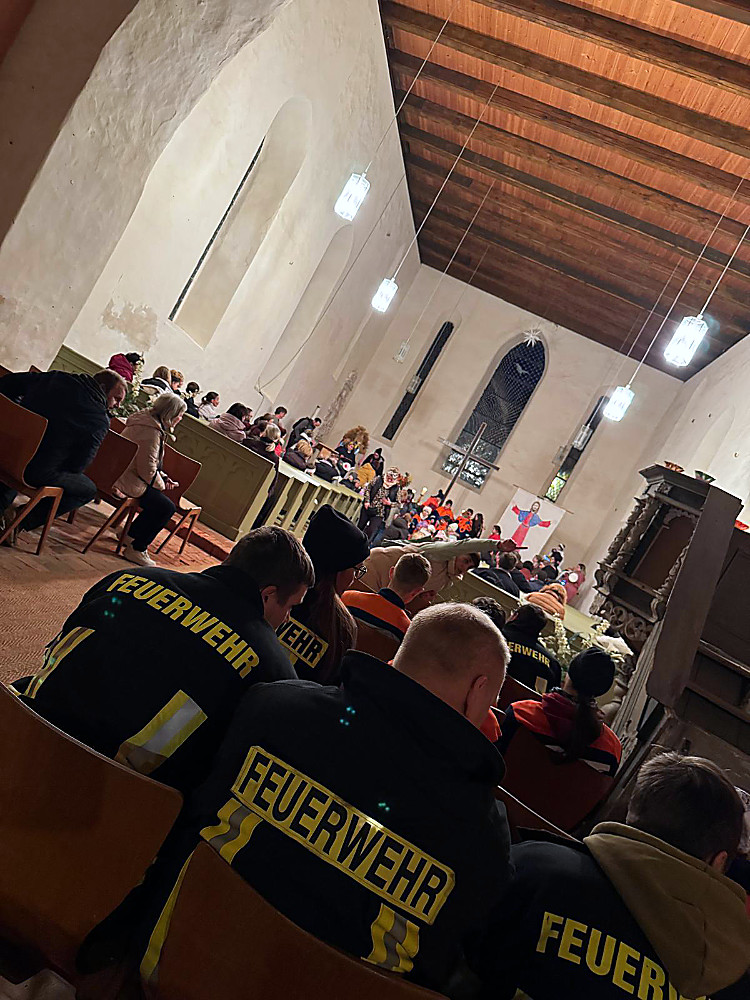 Zur Andacht als Start füllte sich die Kirche, viele waren gekommen, auch die hinteren Stuhlreihen waren gefüllt: die Kita-Kinder in Begleitung von Eltern, Geschwistern, Omas & Opas, die Kinder- & Jugendfeuerwehr mit den erwachsenen Kameraden, Kinder aus anderen Teilen unserer Kirchengemeinde, Gemeindekirchenratsmitglieder ….Ein wunderbar buntes, vielfältiges Bild!