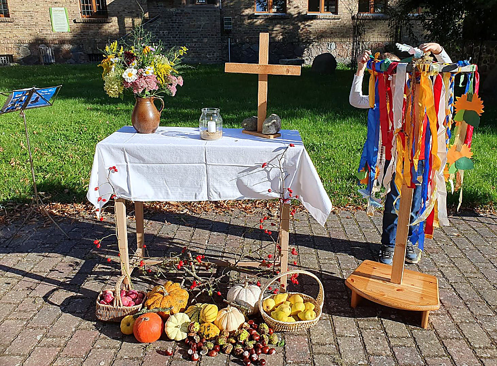 Eine etwas andere Erntekrone schmückte im Erntedankgottesdienst in Lietzen den Altar. Nicht in der Kirche, sondern draußen unter einem strahlenden blauen Himmelszelt. Statt Getreideähren hängen bunte Bänder mit kleinen Vögeln darinnen herab.