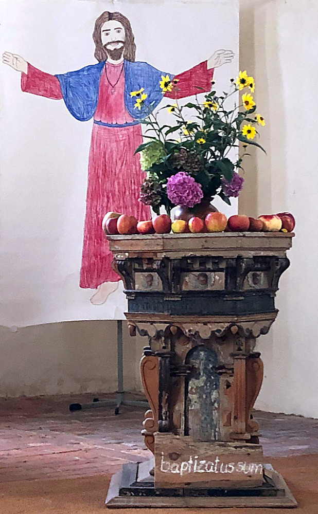 Im Oktober bereiteten wir das Erntedankfest vor, gemeinsam mit einigen Erwachsenen, die sich zum „Kirchputz“ verabredet hatten. Es gab Getränke und Kuchen und so wurden die fleißigen Kirchputzer spontan in unsere Runde eingeladen. Die Kinder und Erwachsenen tauschten sich über die Taufe aus, denn wir feierten an diesem Freitag, dem 10.10. den 10. Tauftag von unserem Arthur. Alle bekamen kleine „Mutmach-Fische“ für die Feder-, Hosen- oder Jackentasche, als Erinnerung an Gottes guten Segen mit für all unsere Wege!
